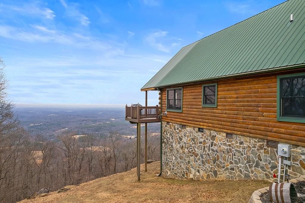 This image showcases the side of a rustic cabin-style house with a striking combination of wooden siding and a stone base. The cabin features a sloped green metal roof that contrasts beautifully with the rich brown wood. Large windows framed in green open towards panoramic views of the distant landscape. A small deck protrudes from the side, inviting outdoor relaxation amidst nature. The surrounding terrain is a mix of grassy areas and trees. The overall aesthetic reflects harmony with the natural environment, producing a warm and inviting retreat that emphasizes simplicity and craftsmanship.