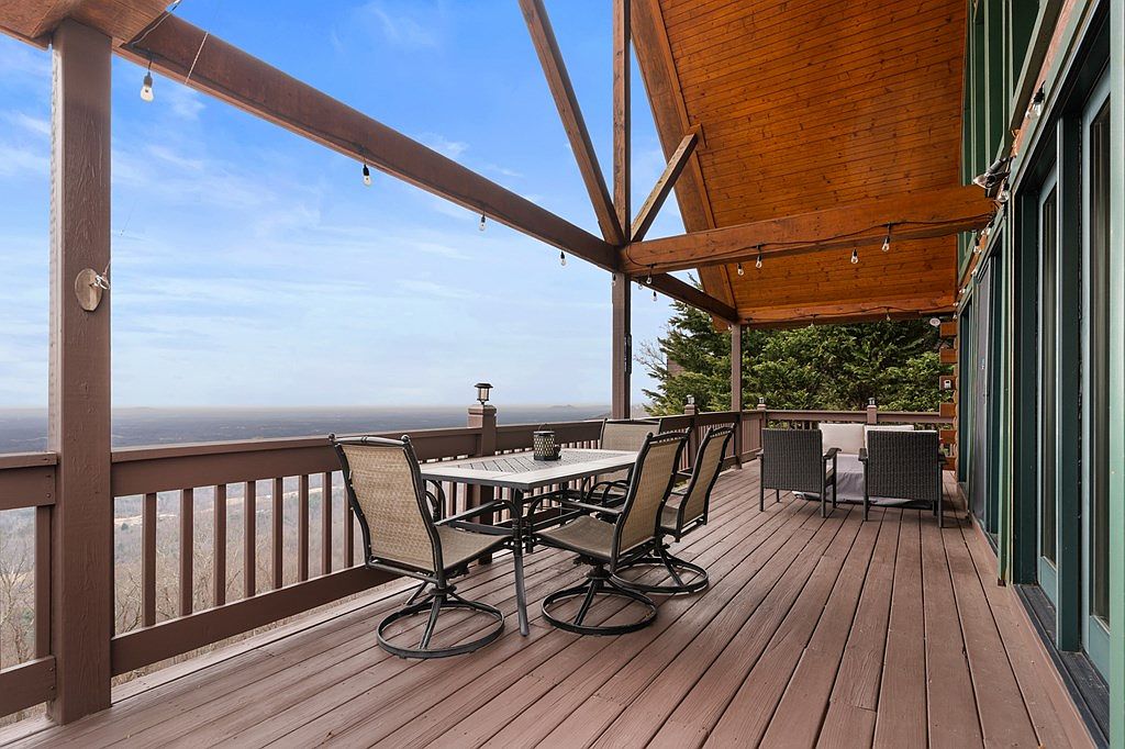 This outdoor deck features a spacious layout with wooden decking and an impressive post-and-beam ceiling. The natural wood tones create a warm and inviting atmosphere against the backdrop of a vivid blue sky. A rectangular dining table, surrounded by four stylish chairs, is positioned to capture breathtaking views of the landscape. Two additional seating areas with high-back chairs provide cozy spots for relaxation, accented by low tables. Decorative string lights add ambiance for evening gatherings. Lush greenery borders the view, enhancing the connection with nature, making this space perfect for entertaining or quiet reflection.