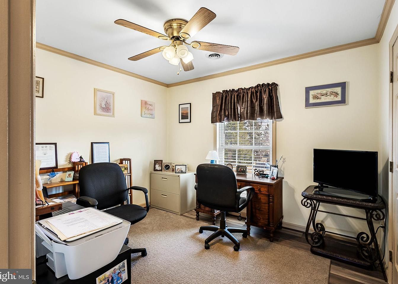 This home office features a warm and inviting aesthetic with a soft beige color scheme accented by rich brown and wooden elements. A ceiling fan with wooden blades hangs above, providing a cozy atmosphere. To the left, a simple desk is accompanied by a black office chair, while a stylish wooden desk against the wall awaits use, complete with a monitor. Framed artwork adorns the walls, adding a personal touch. Natural light enters through a window, dressed with dark brown drapes. The plush carpet offers comfort underfoot, creating an ideal workspace for productivity.