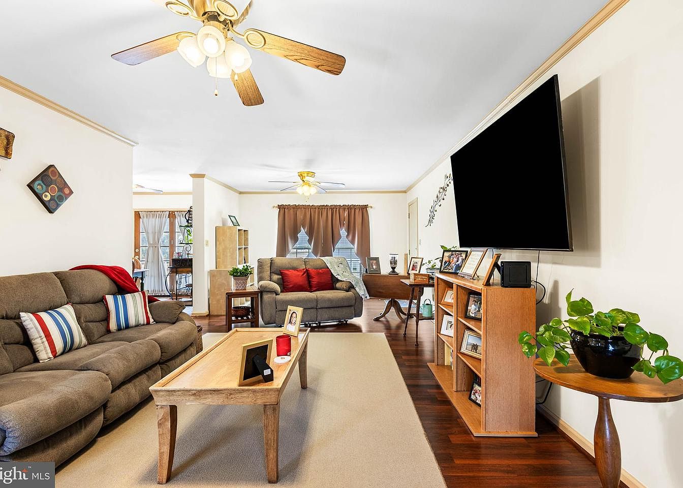 This cozy living room features a light-colored wall adorned with subtle decorative accents. A plush sectional sofa with striped and solid cushions provides comfortable seating, complemented by a warm wooden coffee table at the center. Rich brown floors contrast nicely with the beige carpeting. A large, flat-screen television hangs on one wall, while a wooden bookcase beside it displays family photos and knickknacks. Natural light filters through the window, dressed with flowing brown curtains. A ceiling fan with wooden blades adds charm, while potted plants introduce a touch of greenery, enhancing the inviting atmosphere.