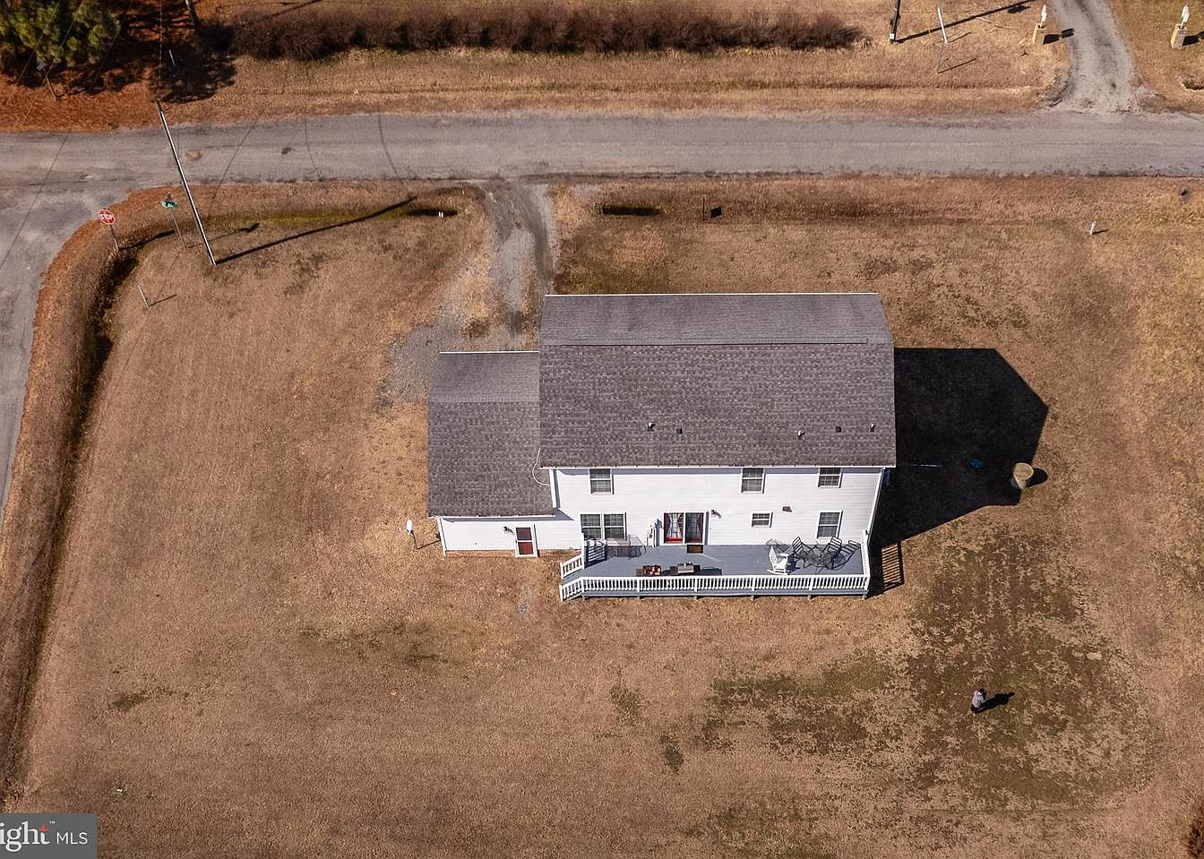This aerial view showcases a spacious property featuring a two-story white house with a grey asphalt shingle roof. The home includes a large, inviting front porch with a white railing. Stretching ahead is a well-maintained yard surrounded by sparse brown grass, indicating a rural setting. The driveway leads to the road, emphasizing the property’s open space. The surrounding landscape is predominantly flat, adding to the serene ambiance. The view captures an arrangement of outdoor seating on the porch, enhancing the outdoor living appeal. Overall, the aesthetic combines a classic farmhouse style with natural, expansive surroundings.
