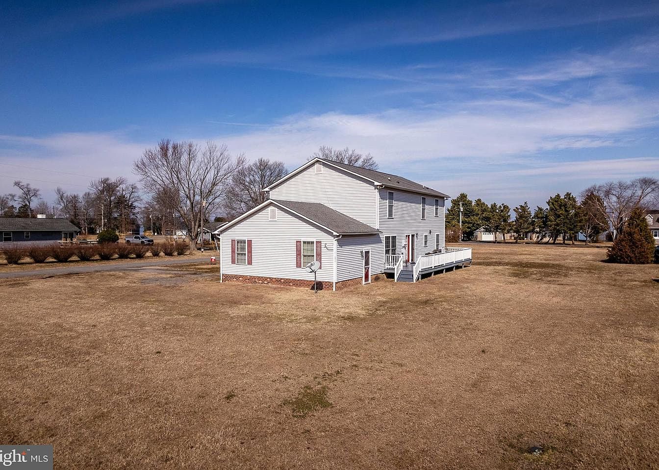 The image showcases the side of a spacious two-story historic American home, characterized by a light-colored siding and red accents around windows and doors. The property features a well-kept lawn, bordered by a variety of trees in the background. A large wooden deck extends from the back, providing a perfect outdoor space for relaxation. The house displays a mix of traditional and modern architectural elements, evident in the varied rooflines and window styles. An open area surrounds the house, lending a sense of openness and tranquility, ideal for family gatherings or outdoor activities.