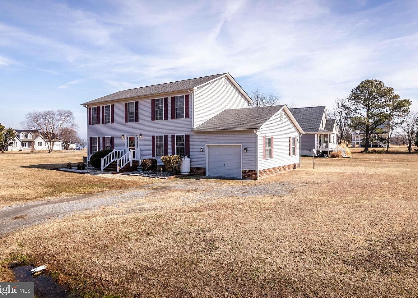 This exterior view showcases a two-story historic American home. The house features a classic colonial design with light beige siding, complemented by dark maroon shutters flanking the windows. A welcoming front porch with white railings invites visitors, leading up from a gravel driveway. The yard is expansive, featuring dry, well-maintained grass that extends around the property. A small garden with shrubs sits beside the entryway, enhancing the landscape. To the side, a one-car garage with a simple white door offers convenience, while additional homes and trees create a serene, suburban backdrop, evoking a peaceful community atmosphere.