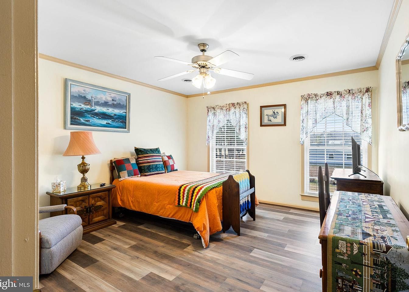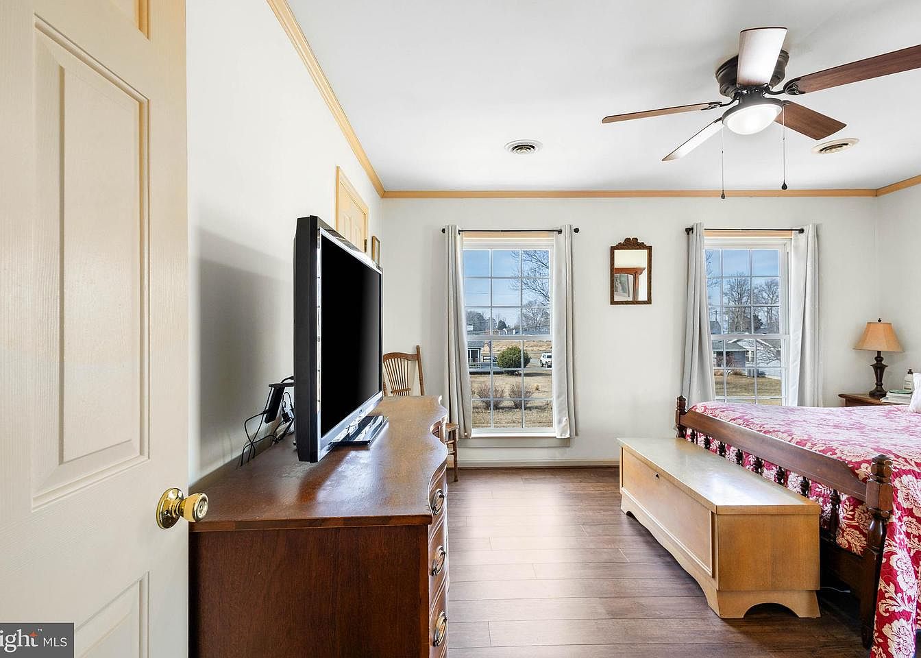 This bedroom features a spacious layout with two large windows dressed in light grey curtains, allowing natural light to fill the space. The walls are painted in a soft, warm white, complemented by natural wood trim. A wooden dresser holding a flat-screen TV occupies one side, showcasing rich, dark tones. A cozy bed, adorned with a floral patterned pink and white bedspread, is positioned against the opposite wall, accompanied by a light wood storage bench at the foot. A bedside table with a lamp offers practical lighting. The ceiling fan blends functionality with aesthetic appeal.