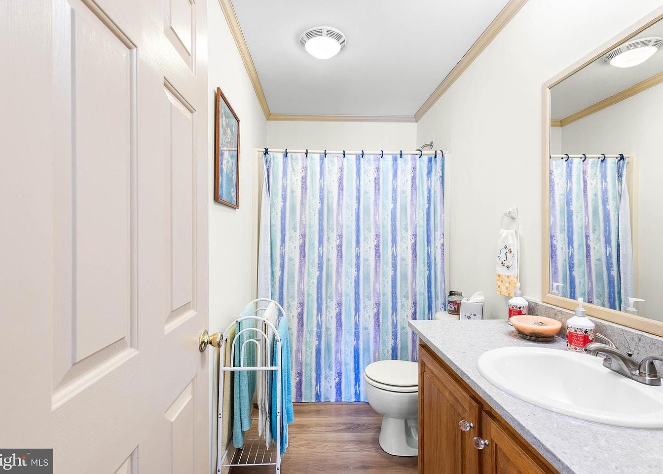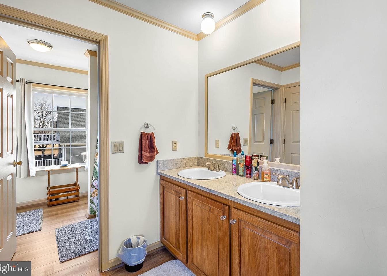 A well-appointed bathroom features a dual vanity with a smooth granite countertop and elegant wooden cabinetry. The space is illuminated by a ceiling light and natural light from a window, adorned with white curtains. The arrangement includes two sinks, each with polished brass faucets, and a large mirror framed in wood. Accessories include neatly placed toiletries, a plush rug in light grey, and a small trash bin discreetly positioned. Walls are painted a soft white, accented with light brown trim, enhancing the overall brightness and airy feel of the room, complemented by a welcoming hardwood floor.