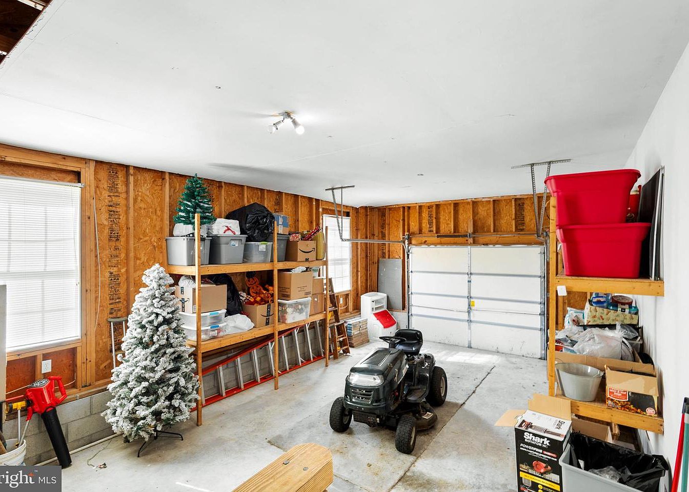 A spacious garage featuring a concrete floor and wood-paneled walls, showcasing a practical and organized layout. To the left, a shelf holds various plastic bins and boxes, storing seasonal decorations and tools. A small, artificial Christmas tree stands next to the shelving, adding a festive touch. A riding lawn mower is prominently parked, indicating functionality. Natural light streams in through a window, complementing the overhead track lighting. The garage door is functional, with a clean design, enhancing accessibility. Overall, the space conveys an efficient, multi-purpose area suitable for storage and vehicle maintenance.