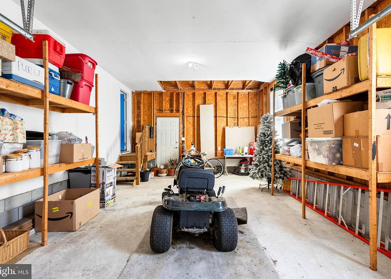 This garage area features a practical layout with wooden shelving units lining both sides, filled with storage bins and boxes, showcasing an organized yet cluttered aesthetic. A riding lawn mower is positioned centrally, highlighting the functionality of the space. The walls have natural wood paneling paired with a clean white finish, providing a rustic charm. Natural light enters through a window, complementing the simplicity of the concrete floor. A small staircase leads to an upper level, with a closed door visible, suggesting additional storage or access. A holiday tree subtly indicates seasonal decor.