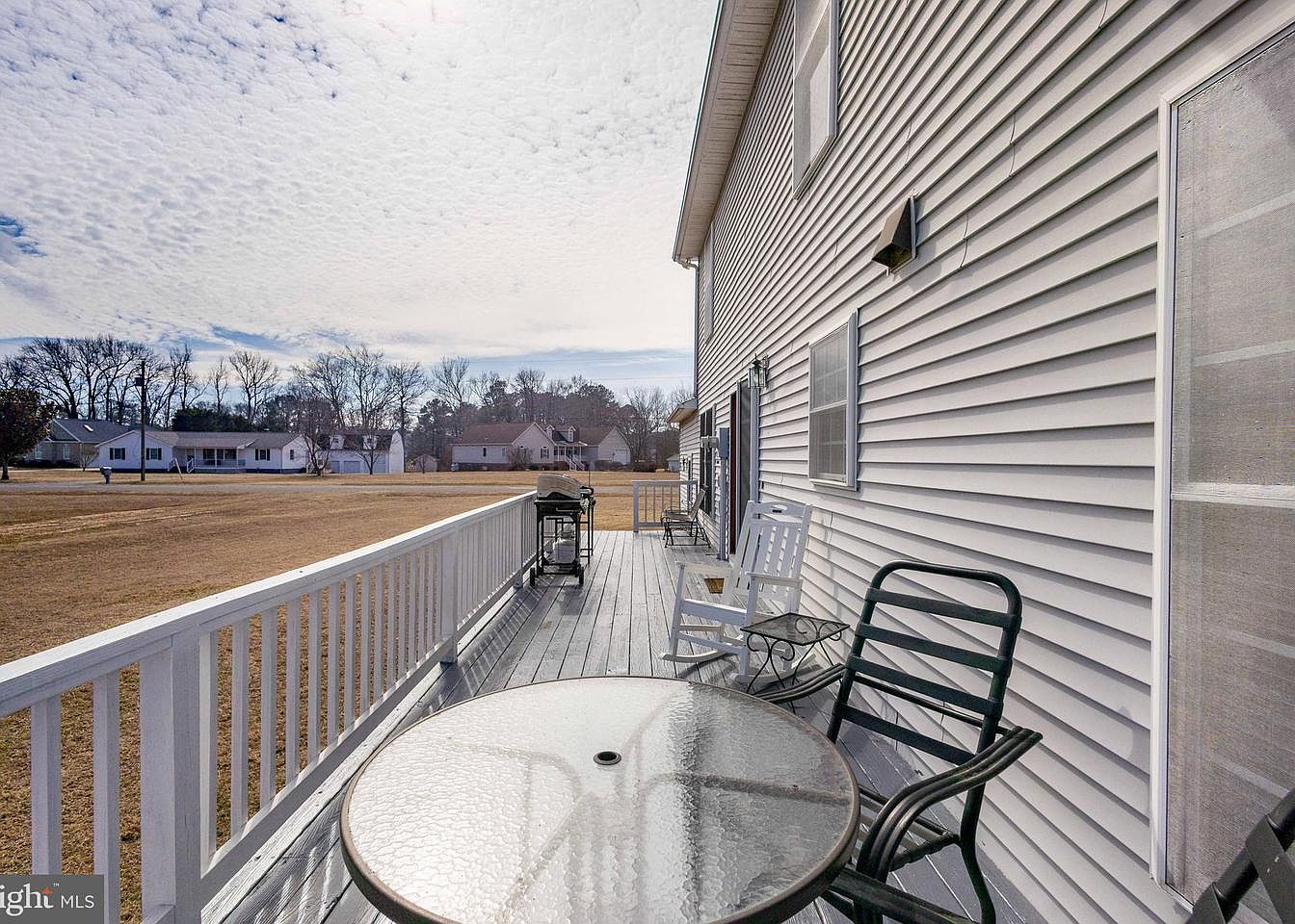 The image shows a spacious deck adorned with a glass-topped table, surrounded by black metal and white wooden chairs. The deck features a smooth, gray wooden surface complemented by a white railing that offers an unobstructed view of the expansive yard. In the background, a serene landscape includes leafless trees and neighboring houses, enhancing the peaceful ambiance. The sky features a soft, textured cloud pattern, adding to the tranquil setting. This outdoor space encourages relaxation and social gatherings, making it ideal for enjoying sunny days and pleasant evenings.