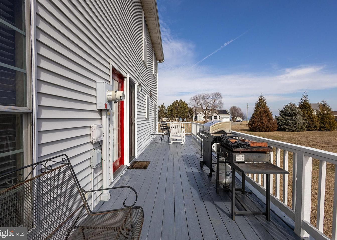 A spacious outdoor deck extends from the house featuring grey wooden flooring. A stylish black metal bench is positioned against the wall, complemented by a white wooden rocking chair nearby, inviting relaxation. The deck is bordered by a white railing, offering an open view of the yard. A modern grill sits on the right, equipped for outdoor cooking, while utility meters and light fixtures provide functional details. The house is clad in light grey siding with a bright red door that adds a pop of color. In the background, mature trees and distant homes enhance the tranquil setting.