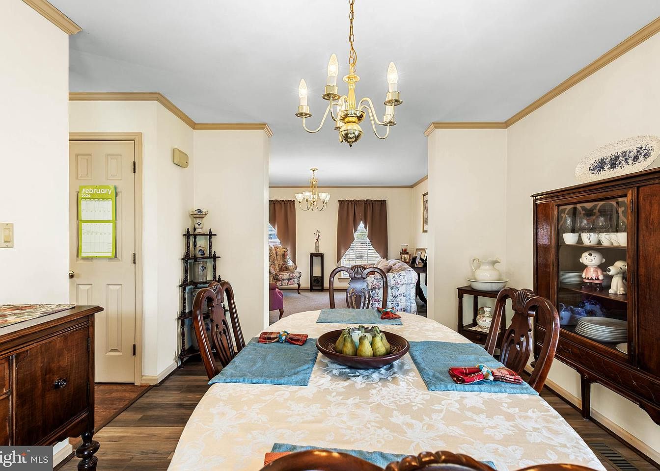 A spacious dining room features an elegant wooden table set with a delicate white floral tablecloth and tasteful blue runner. Surrounding the table are ornately carved wooden chairs, showcasing intricate details. A rich, dark mahogany china cabinet displays charming china and collectibles, adding to the room’s character. Warm, soft lighting is provided by a vintage chandelier, complemented by another fixture in the adjoining space. The beige walls contribute to a cozy ambiance, while the deep brown curtains frame windows, enhancing the inviting atmosphere. A glimpse of the adjacent living area, adorned with plush seating, is visible in the background.