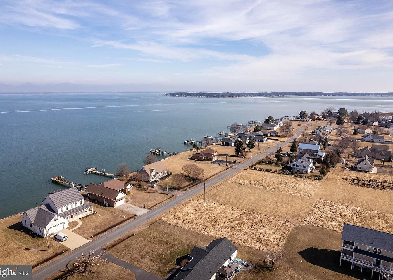 An aerial perspective reveals a serene coastal scene, showcasing a mix of residential properties along a tranquil waterway. The color palette features soft earth tones in the houses, highlighted by muted greens and browns of the vegetation. Structures vary in style, with sloped roofs and inviting porches enhancing their charm, while some boast waterfront access via private docks. Sandy patches and sparse grassy areas dot the landscape, suggesting a blend of buildable land and natural beauty. The expansive view of the water, reflecting the sky’s soft blue hues, creates a peaceful atmosphere ideal for coastal living.