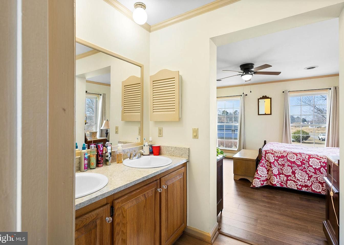A view into a bathroom seamlessly connected to a bedroom area. The vanity features double sinks set in a beige countertop, with warm wooden cabinetry below. A large mirror reflects the light, enhancing the airy feel. Shelved wooden doors provide smart storage, while toiletries are neatly arranged on the countertop. The color palette is soft, with neutral cream walls and honey-toned wood accents. Abundant natural light pours from the adjacent bedroom, where a floral-patterned bedspread introduces a pop of color. Light wooden flooring complements the warm tones, creating a cozy, inviting atmosphere.