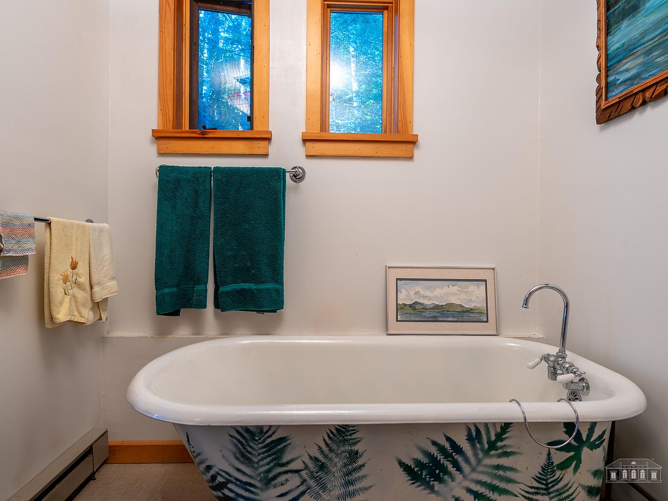 A cozy bathroom space featuring a vintage clawfoot tub adorned with delicate fern patterns on its base. Natural light cascades through two wooden-framed windows, creating a serene atmosphere. Plush teal towels hang neatly on chrome fixtures, complementing the warm wood tones throughout. A small framed landscape painting rests atop the tub, enhancing the inviting decor. The walls are painted a soft neutral hue, enhancing the room’s brightness, while simple tile flooring adds a practical touch. The overall design emphasizes a blend of rustic charm and soothing color palette, perfect for relaxation and tranquility.