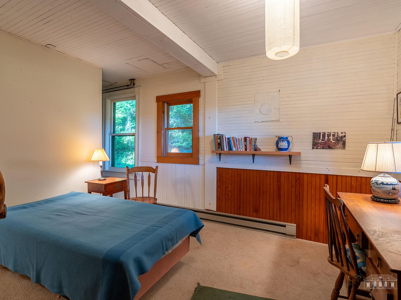 A cozy bedroom featuring a soft blue blanket draped over a neatly made bed. Warm wood accents frame two windows, allowing natural light to fill the space. On the left, a small bedside table holds a lamp, casting a gentle glow. Across from the bed, a wooden desk showcases a few books and decorative items, complementing the room’s inviting atmosphere. The walls are painted in a light tone, and a beadboard section adds texture near the bottom. A simple pendant light hanging from the ceiling completes the minimalist aesthetic, creating a serene retreat.