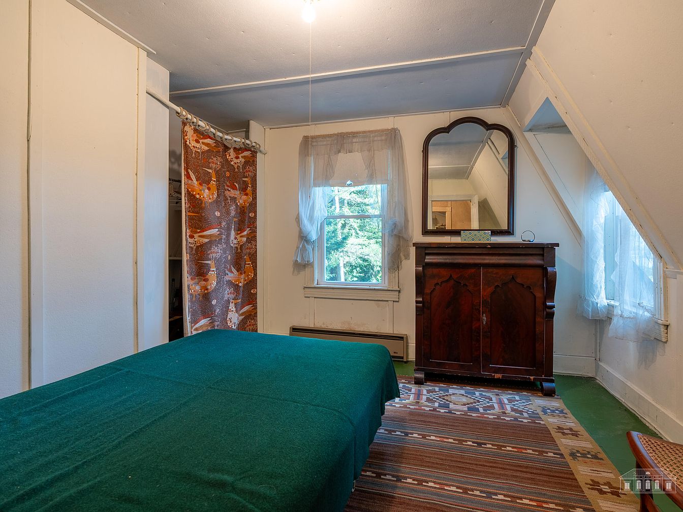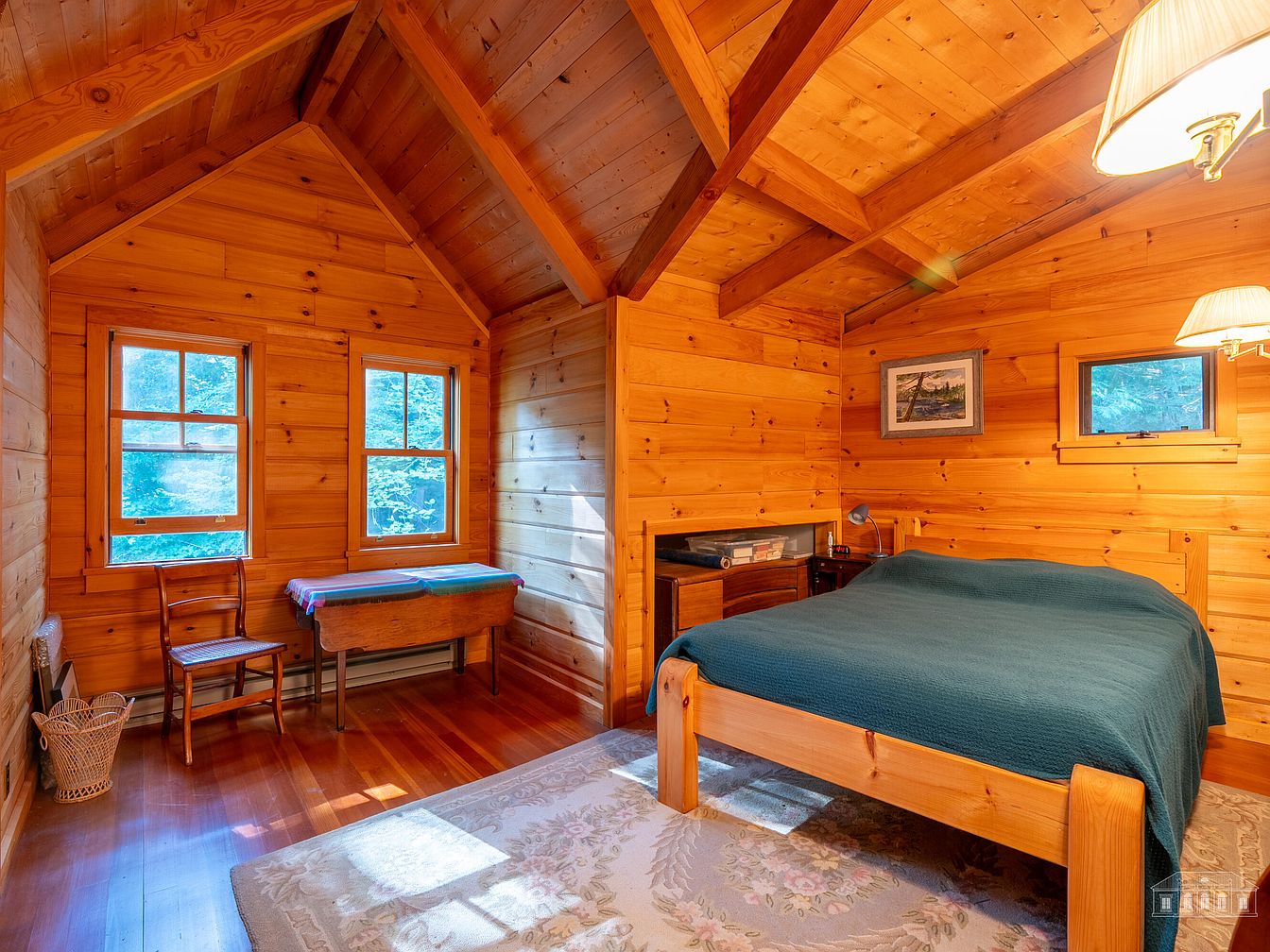 This cozy bedroom features warm wooden walls and an angled ceiling, exuding a rustic charm. Natural light pours in through two windows, framed by simple wood trims, creating a welcoming atmosphere. The room includes a wooden bed with a deep blue bedspread, paired with delicate side tables that match the wooden aesthetic. A vintage chair beside a small table adds character, while a decorative area rug with floral patterns softens the hardwood floor. The warm tones of the wood enhance the tranquil feel, making it an ideal space for relaxation and rest.