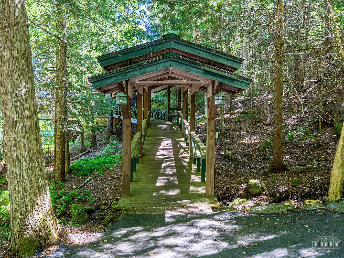 A rustic wooden pathway leads through a lush green forest, framed by towering trees and vibrant greenery. The structure features a canopy roof supported by timber beams, enhancing the natural aesthetic. The path is wide, made of planks with a smooth finish, inviting exploration. Hidden lanterns along the sides add a warm, welcoming touch. Surrounding ferns and soft earth tones create a tranquil atmosphere, while sunlight filters through the leaves, casting playful shadows. The earthy color palette of deep greens and browns harmonizes with the landscape, blending architectural elements seamlessly with nature.
