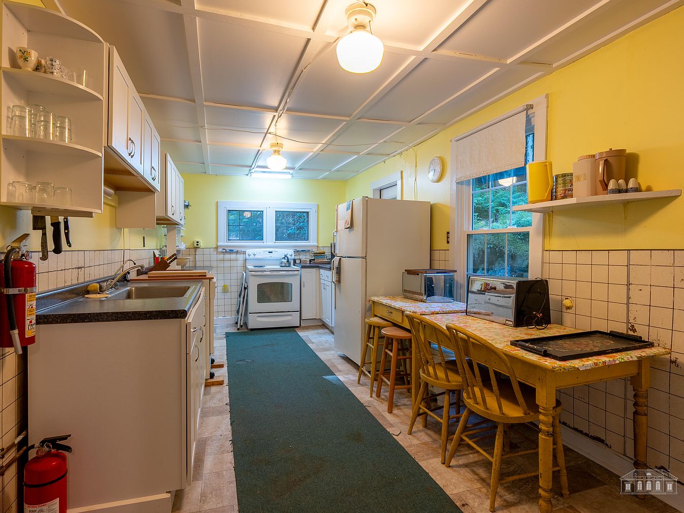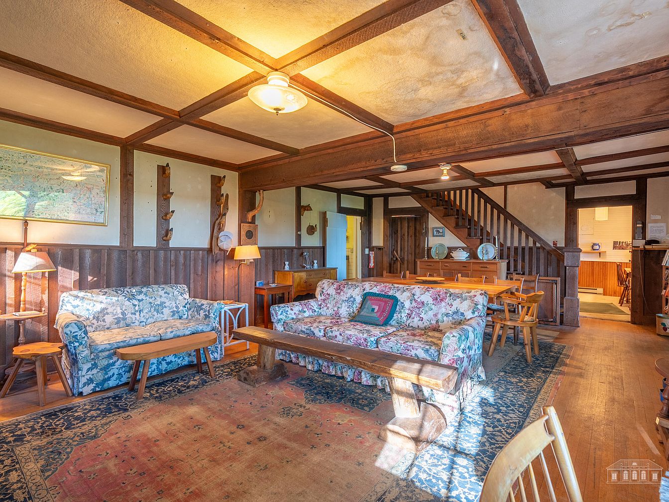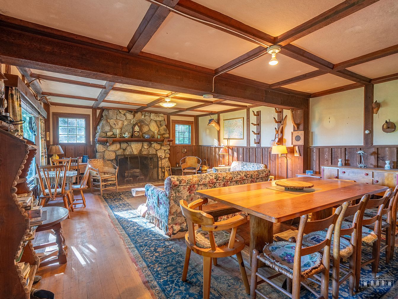 A cozy living room features a stone fireplace as a focal point, surrounded by wood-paneled walls that give a warm rustic feel. The room includes a large wooden dining table, accompanied by several wooden chairs, fostering an inviting atmosphere for gatherings. A floral-patterned couch adds a splash of color against the neutral hues of the walls, while a soft blue area rug anchors the space. Well-placed windows provide natural light, enhancing the airy feel. Decorative items like lamps and small shelves add personality, contributing to a charming, lived-in look that resonates with the home’s historic character.