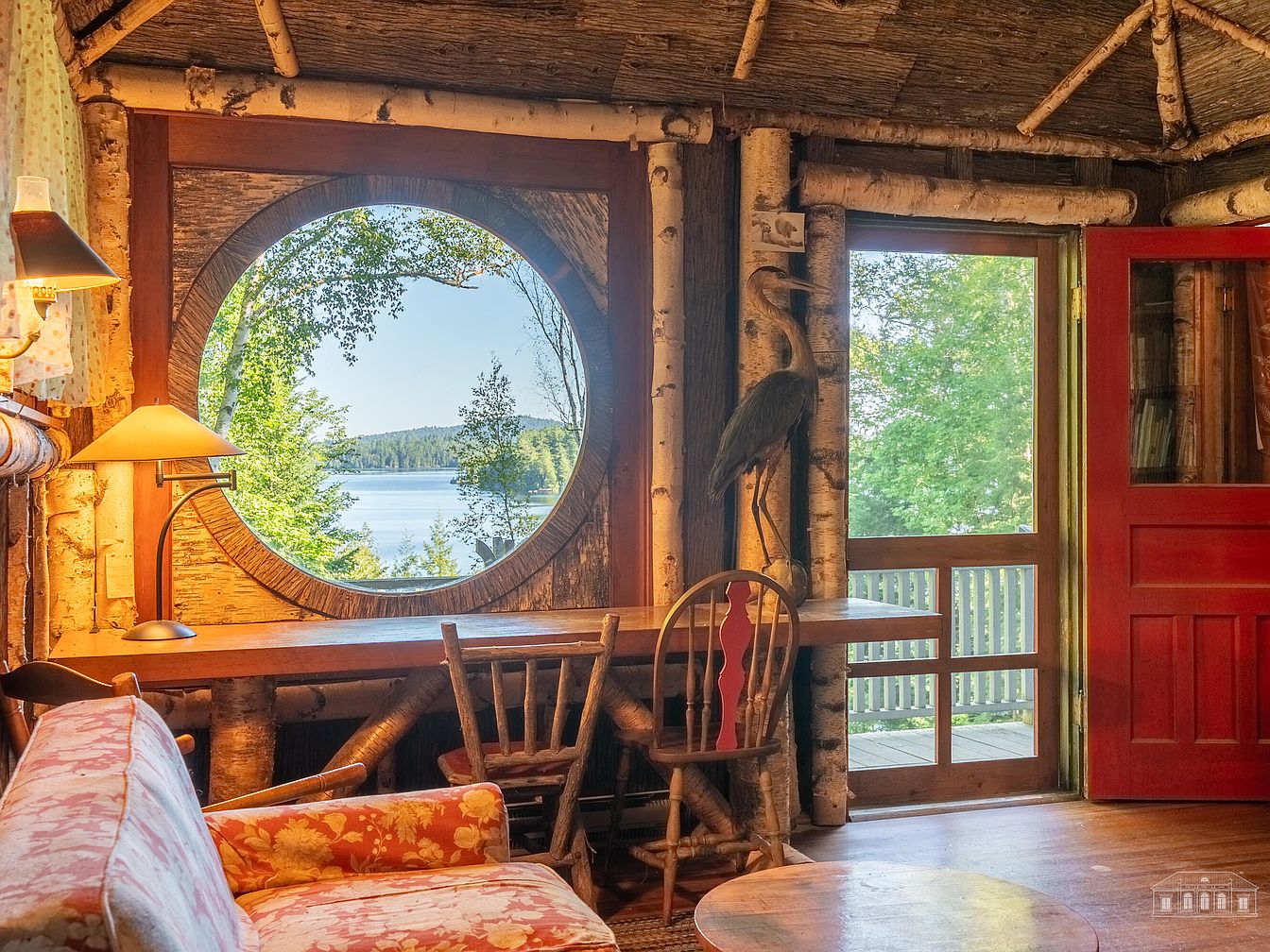 This intimate corner of a historic home features a circular window that perfectly frames a scenic view of lush trees and a tranquil lake. The room boasts rustic charm, highlighted by exposed wooden beams and birch log walls. A soft floral-patterned couch invites relaxation, while a simple wooden table serves as a workspace. Nearby, a classic wooden chair complements the rustic furniture. A stylish lamp casts a warm glow, and a striking red door adds a pop of color to the space, harmonizing with the natural elements and creating a cozy atmosphere perfect for enjoying nature.