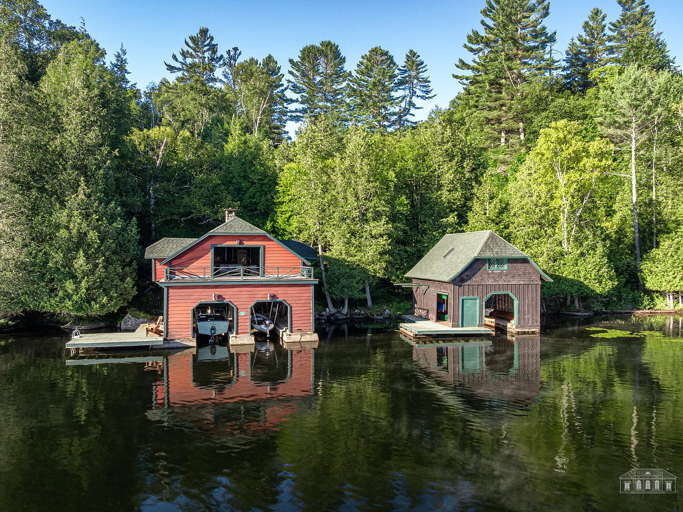 Two charming boathouses are nestled beside a tranquil lake, surrounded by lush greenery. The larger boathouse features a striking red exterior with white trim and two open docks for boats, while its quaint rooftop with shingled detailing adds character. A secondary, smaller structure showcases a deep brown wood finish, harmonizing beautifully with the natural surroundings. Both buildings have large openings that provide access to the water, reflecting rustic elegance. The serene lake reflects the colorful facades perfectly, coupled with tall trees that create a private atmosphere, enhancing the picturesque setting of this enchanting waterfront property.