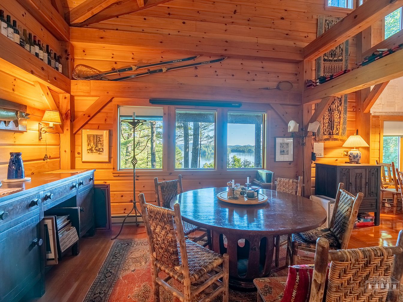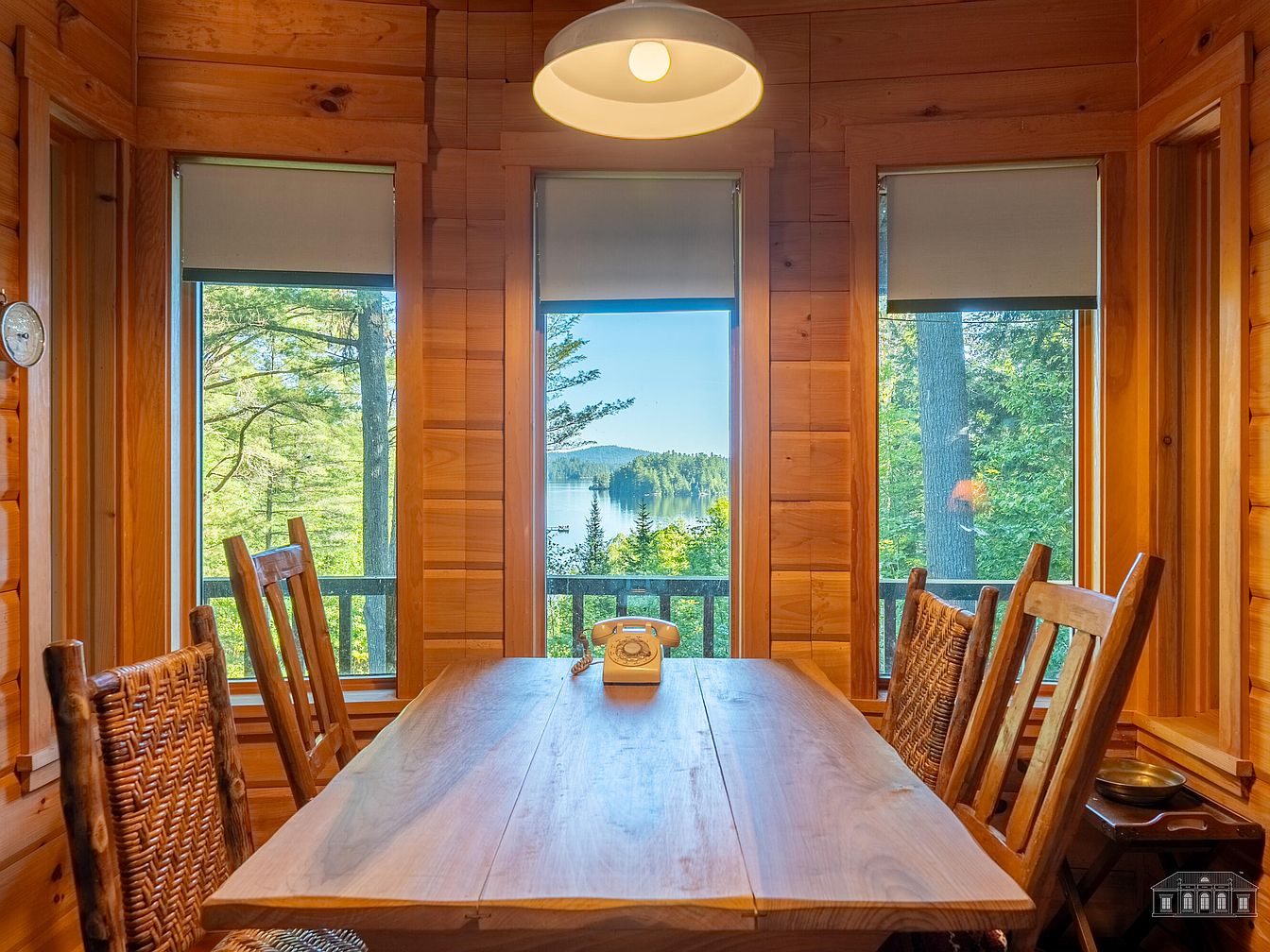 A charming dining area showcases a rustic wooden table set against large windows that frame a serene lakeside view. The warm, natural wood tones of the walls and furniture create a cozy ambiance, complemented by a light fixture that adds a modern touch. Surrounding the table, sturdy wooden chairs, some with woven accents, provide a comfortable seating arrangement. Natural light pours in, enhancing the area’s inviting atmosphere. A vintage rotary phone rests on the table, serving as a nostalgic accent. Overall, the space harmonizes nature with rustic elegance, ideal for gatherings or quiet meals with picturesque surroundings.