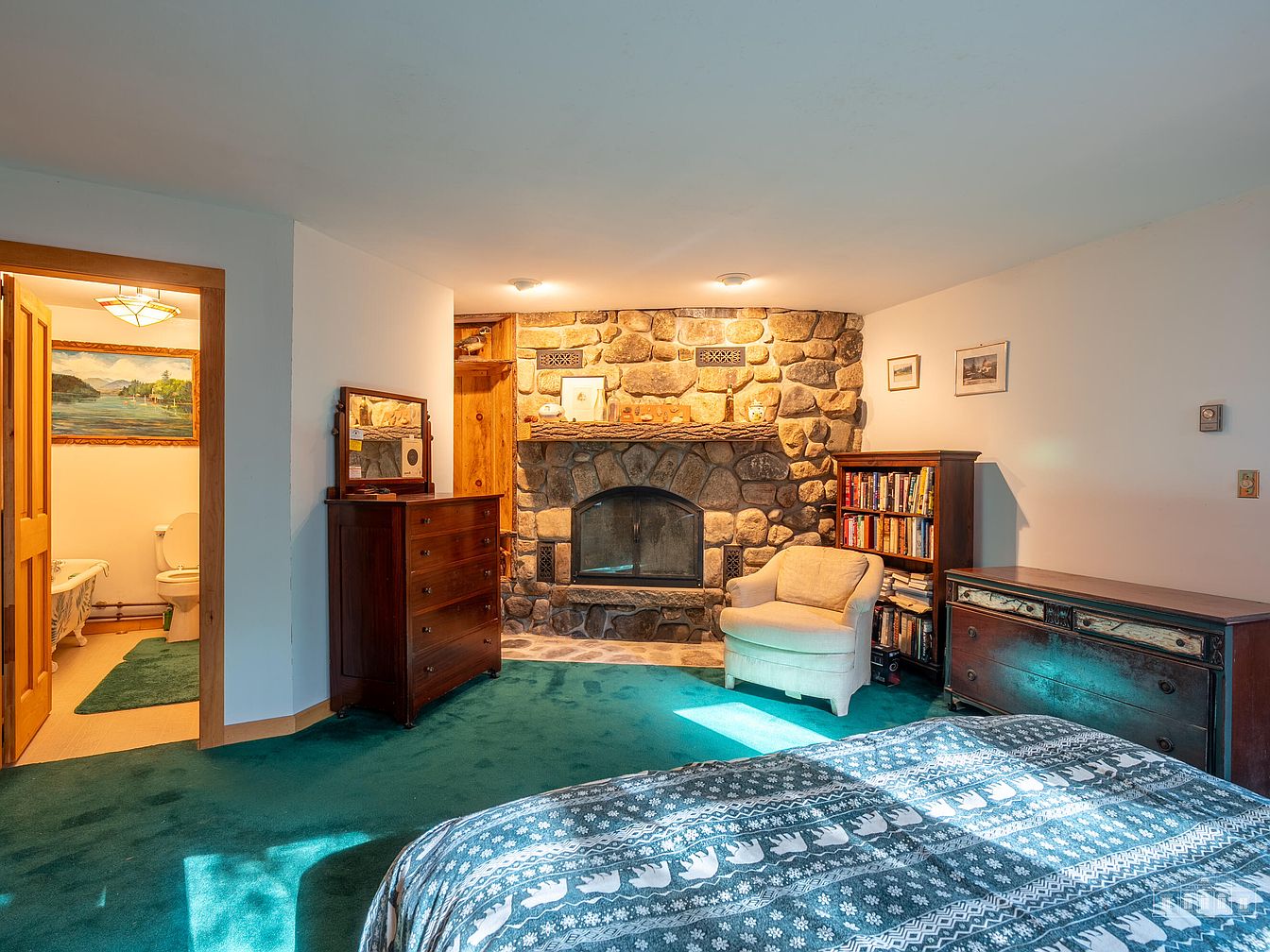 This master bedroom features a cozy layout with a harmonious blend of textures and warm colors. The floor is covered in plush teal carpeting, creating a soothing atmosphere. A stone fireplace serves as the focal point, framed by decorative shelves holding trinkets. The walls are painted in a light neutral tone, enhancing the room’s brightness. A large wooden dresser sits against one wall, while a bookshelf filled with books adds personality. A comfortable, cream-colored chair invites relaxation beside the fireplace. Soft, patterned bedding complements the overall aesthetic, merging rustic charm with comfortable living.