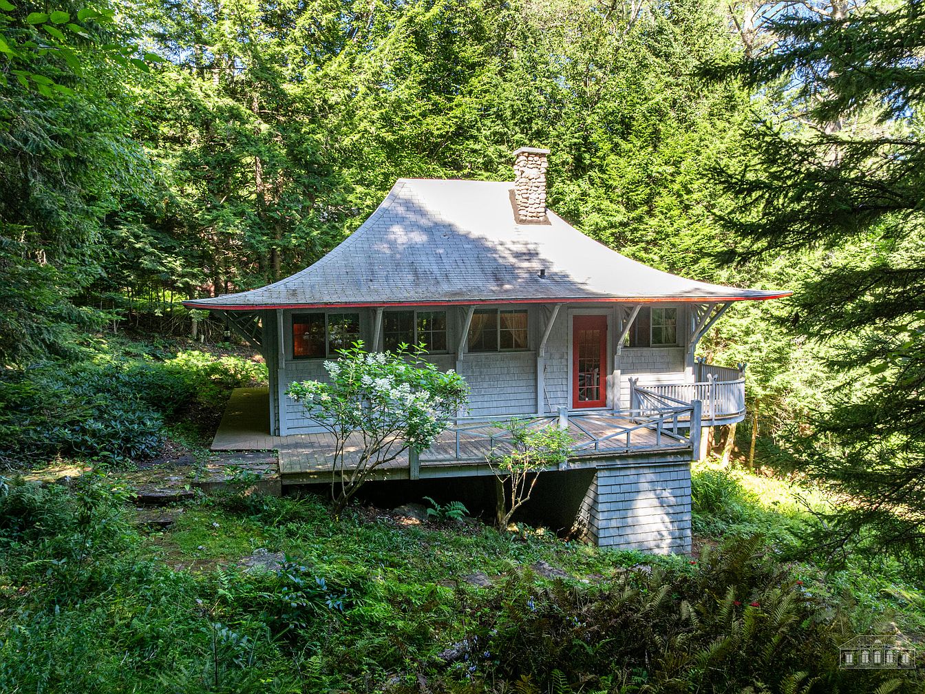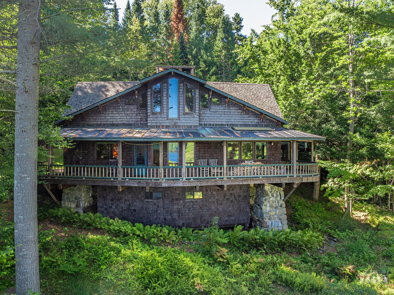 Showcasing a charming, historic American home nestled among lush greenery, the house harmonizes with its natural surroundings. Featuring a distinctive shingle exterior, the structure boasts a combination of wooden tones and natural stone supports. The raised design offers a porch adorned with multiple seating options, inviting relaxation while overlooking the landscape. Large windows illuminate the interior and amplify the connection to the outdoors. The roof combines sloped sections with a sleek metal finish, adding architectural interest. Ferns and other plant life thrive at the base, emphasizing the home’s integration with its scenic, wooded environment.