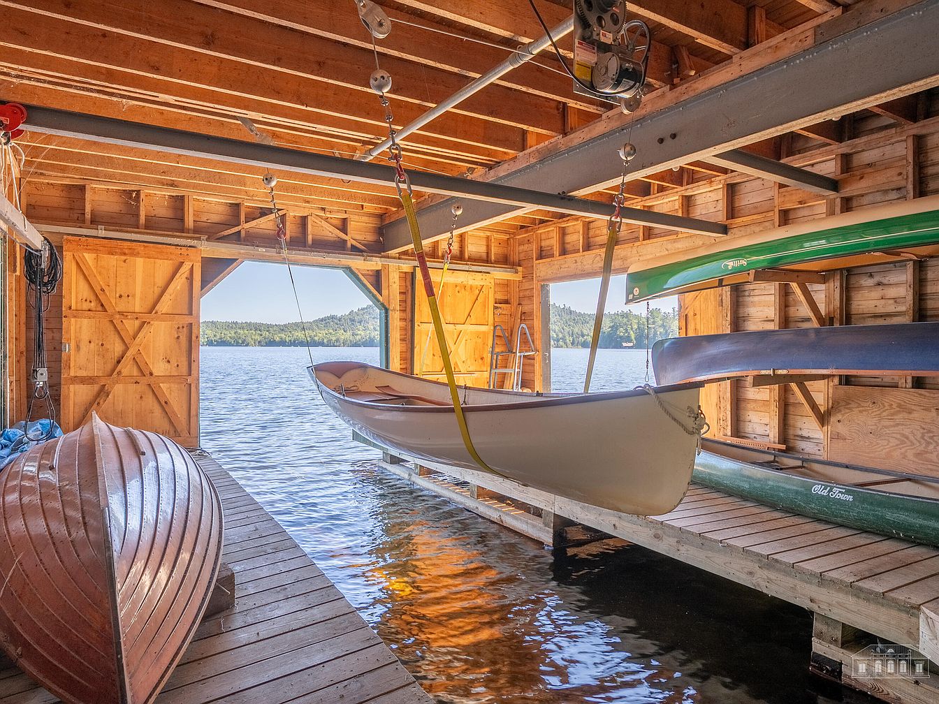 The boat house features a rustic design with natural wood elements, highlighted by exposed beams and a wooden plank floor. A spacious interior opens to beautiful lake views through large double doors. A canoe, suspended from a hoist, hangs above the water, while two long boats rest gently on the floor. The walls are made of warm wood, creating a cozy, inviting atmosphere. Rows of equipment line the walls, enhancing functionality. Sunlight floods the space, reflecting off the water, emphasizing the seamless connection between the structure and its serene lakeside environment.