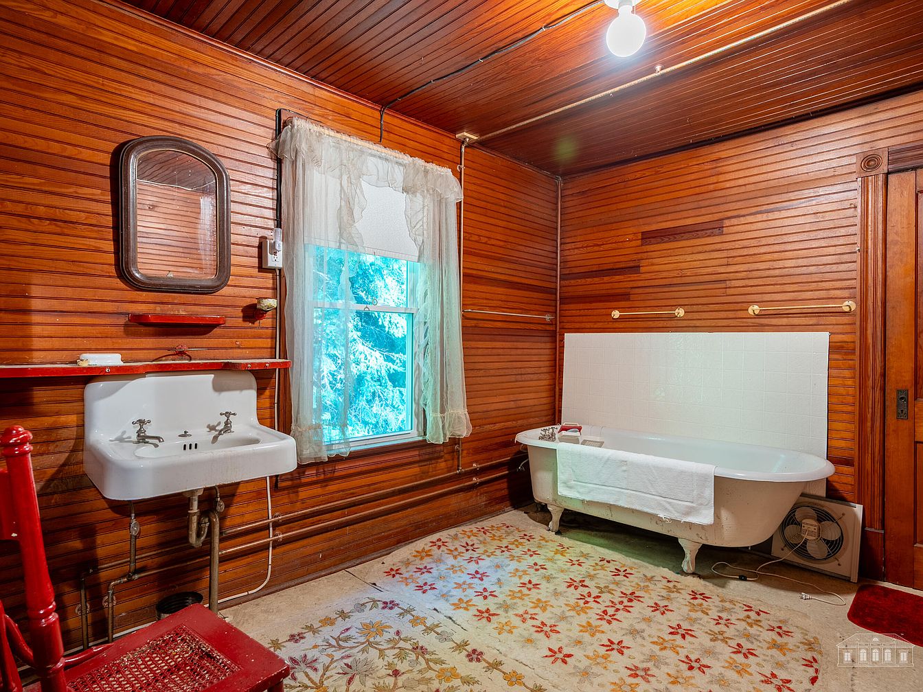 A vintage bathroom featuring warm wood paneling that creates a cozy atmosphere. The layout includes a white clawfoot bathtub positioned against the wall, complemented by a small, ornate faucet. A wall-mounted sink with decorative taps adds character, while an antique mirror hangs above it, reflecting natural light from a nearby window, draped with sheer curtains. The floor showcases an intricate patterned rug with floral designs, enhancing the room’s charm. Additional elements include brass towel racks and a classic wooden door, contributing to the nostalgic appeal of this historic American home.
