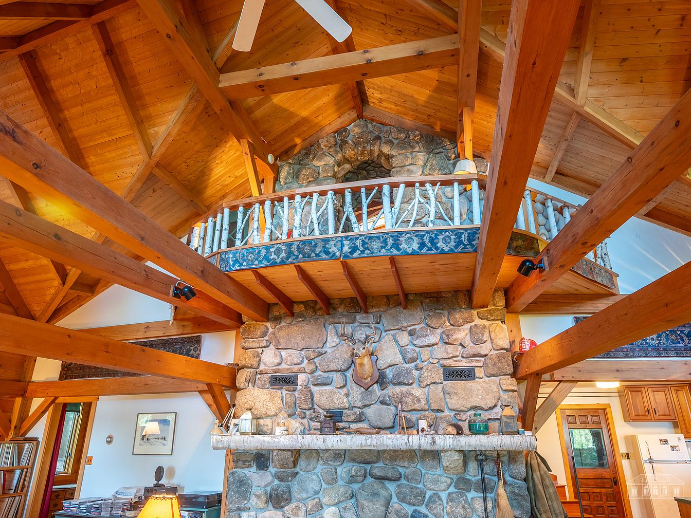 This spacious living room features a striking vaulted ceiling supported by hefty wooden beams, creating an airy and inviting atmosphere. The warm tones of the wood harmonize with the natural stone fireplace, which serves as a focal point. Above, a cozy loft area is highlighted by a rustic railing, adding charm and depth. Soft lighting emanates from a floor lamp, illuminating the seating area with a warm glow. Beside the fireplace, a wooden shelf displays decorative knick-knacks. The surrounding walls feature a neutral palette that enhances the room’s cozy vibe, complemented by tasteful furnishings and artwork.