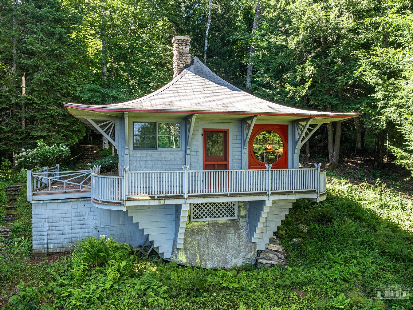 A charming, historic home nestled in lush greenery, showcasing a unique architectural style. The house features a distinctive conical roof, adorned in gray shingles with a vibrant red trim that gives it a cheerful appearance. A wooden deck surrounds the front, leading to an inviting entrance framed by large windows that offer glimpses of the interior. The foundation is raised, enhancing the connection between the house and the natural landscape of trees and foliage around it. This secluded setting is accentuated by a variety of shrubs and undergrowth, creating a harmonious blend of structure and environment.