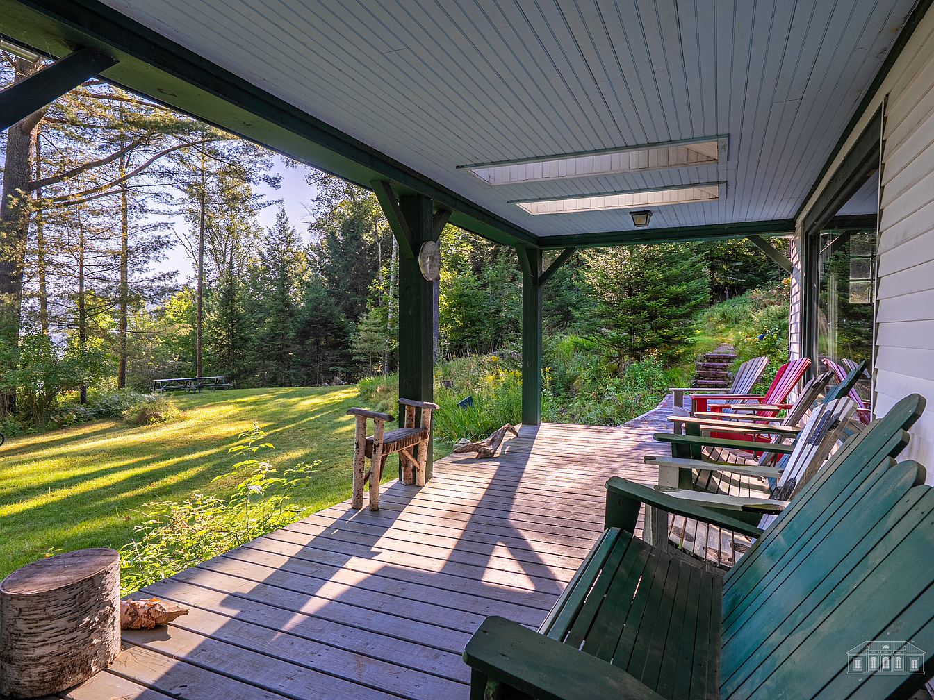 A spacious porch features a combination of rustic charm and relaxed sophistication. Reclaimed wooden beams support a high ceiling painted in a soft blue, complemented by functional ceiling lights. The floor is made of broad wooden planks that have weathered gracefully, adding character. A collection of colorful, mismatched Adirondack chairs—greens, reds, and natural wood tones—invite leisurely seating, positioned to embrace the serene view of manicured grass and lush trees. Sunlight filters through foliage, casting playful shadows on the floor, enhancing the tranquil ambiance. Nearby, a rustic log serves as an informal table, completing this welcoming outdoor retreat.