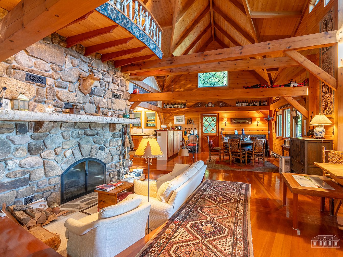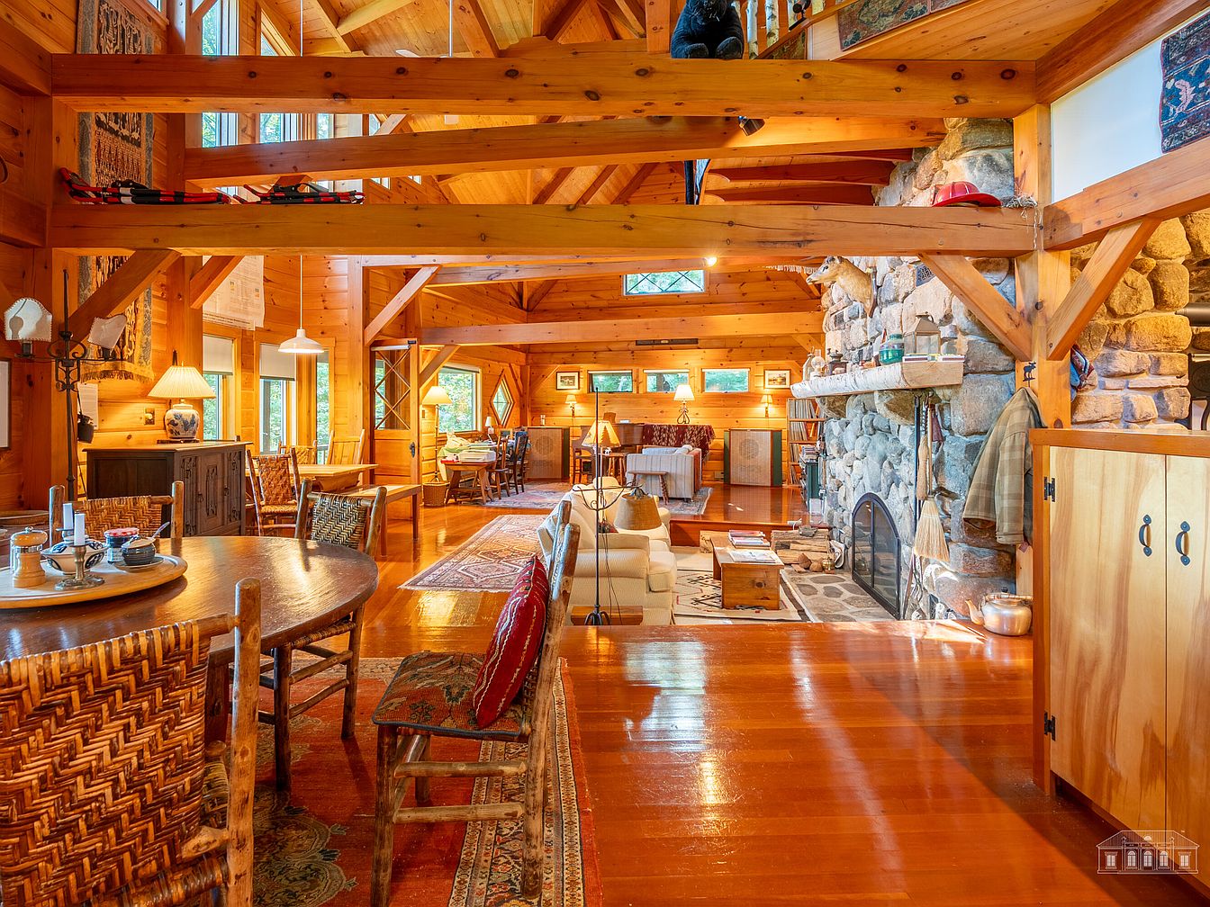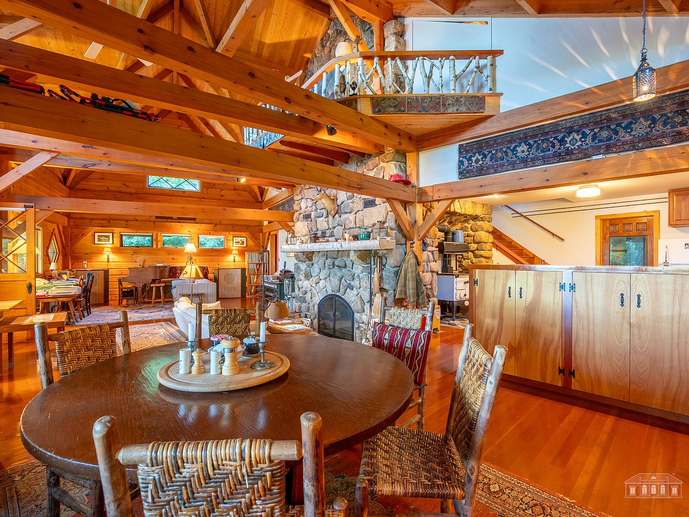 This spacious living room features a striking combination of rustic charm and modern convenience. A large, round wooden table with woven chairs centers the space, inviting gatherings. Exposed wooden beams and a high ceiling enhance the open layout while adding warmth. A stone fireplace stands prominently against one wall, flanked by large windows that allow natural light to flood in, highlighting the honey-colored wooden walls. In the background, a well-equipped kitchen is partially visible with light cabinetry, and a cozy reading nook is tucked beneath the staircase, complemented by eclectic art and textiles throughout.