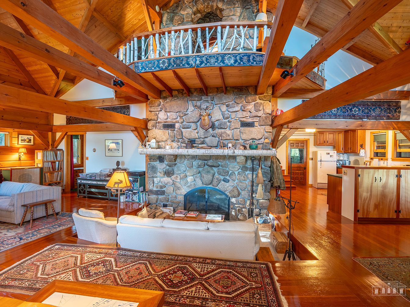 This living room features a spacious, open layout with towering wood beams and a stunning stone fireplace as the focal point. The warm, earthy tones of the exposed wood contrast beautifully with the stone’s rugged texture. A cozy arrangement of upholstered furniture includes a pair of inviting sofas in neutral fabrics, complemented by an ornate area rug that adds character. Natural light floods the space through large windows, enhancing the inviting ambiance. In the background, the kitchen and dining area can be glimpsed, showcasing wood cabinetry and a seamless flow between spaces, promoting a warm, family-friendly atmosphere.