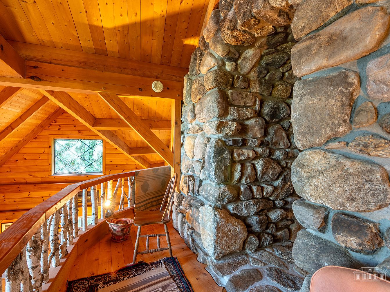 This loft area showcases a warm, rustic aesthetic with a prominent stone wall that lends character and texture. The ceiling features exposed wooden beams, enhancing the space’s natural feel. Large windows allow ample light, highlighting the rich tones of the pine wood paneling. A curved railing made of birch branches adds a unique touch, while a wooden chair offers a cozy seating option. A woven rug lies on the wooden floor, providing contrast and comfort. Overall, the blend of natural materials and warm colors creates an inviting atmosphere ideal for relaxation or reading.