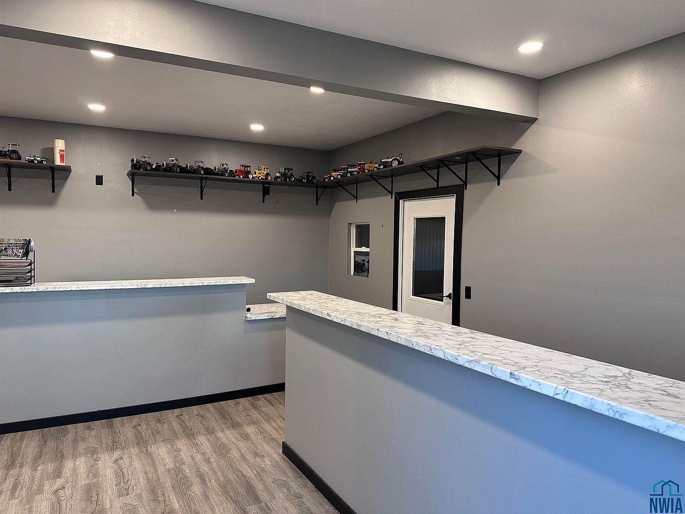 This space features a sleek service counter with a modern design. A countertop with a polished, marbled finish extends across two sides, providing ample space for activities. The walls are painted in a neutral gray, complemented by dark trim and flooring, creating a contemporary look. Above the countertop, a shelf showcases a collection of small model tractors, adding a personal touch and interest. The room is well-lit with recessed lighting, enhancing the open feel. A white door with a glass panel leads to another area, inviting natural light and maintaining visual connection.