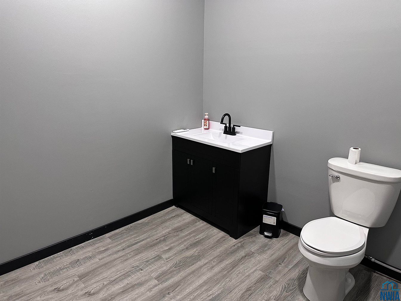 This space features a minimalist bathroom design, showcasing a sleek black vanity with a white countertop. The vanity holds a modern black faucet and a soap dispenser, emphasizing clean lines. Adjacent to the vanity is a white toilet, offering contrast against the gray walls. The flooring mirrors a wood look in a light brown shade, harmonizing with the overall color palette. Black baseboards add a touch of sophistication. The room is well-lit, enhancing its spacious feel despite the compact layout, making the design efficient while retaining a contemporary aesthetic that prioritizes functionality.