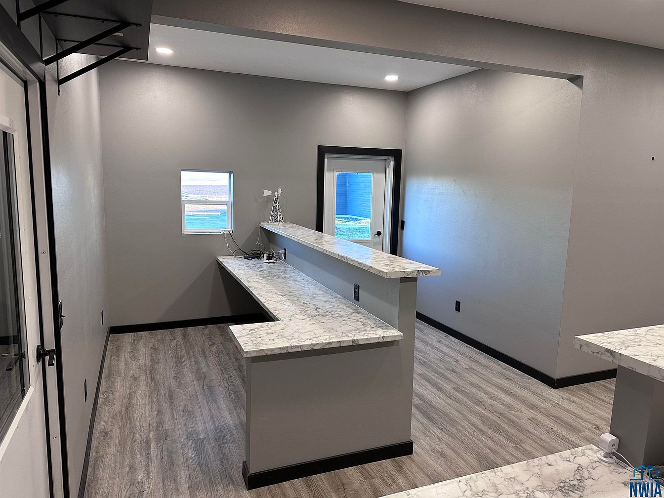 This modern kitchen bar area features sleek, marble countertops that contrast against the soft gray walls. The open layout allows for easy movement, with a low partition serving as a casual dining space. A narrow window brings natural light, accentuating the clean lines of the design. The flooring consists of light wood-like planks, enhancing the contemporary aesthetic. Dark trim surrounds the doorway and windows, adding depth to the room. Simple, functional lighting fixtures illuminate the space, while a small decorative element on the counter provides a personal touch. The overall feel is inviting and efficiently designed.
