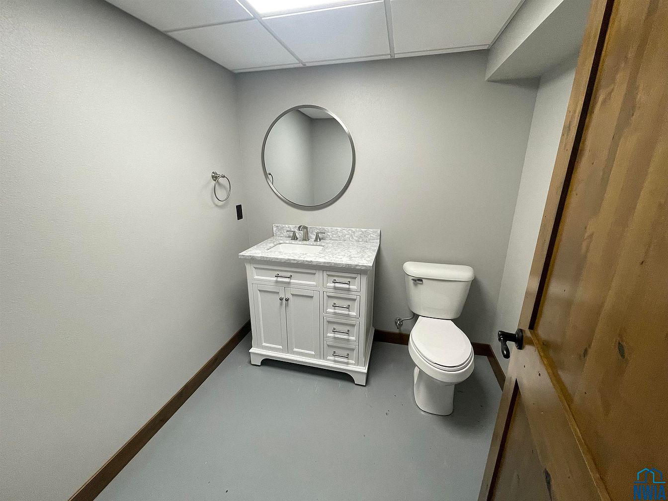 This bathroom features a modern yet simple design with a light gray color scheme that enhances the spaciousness. A white vanity with marble countertop provides a clean focal point beneath a round mirror, reflecting natural light. Elegant silver fixtures complement the vanity. To the side, a white toilet adds to the uncluttered look. The flooring is a smooth gray, matching the walls, while the wooden door introduces a warm contrast, showcasing natural grains. Overall, the design blends functionality with a minimalist aesthetic, creating a serene environment that feels both updated and inviting.