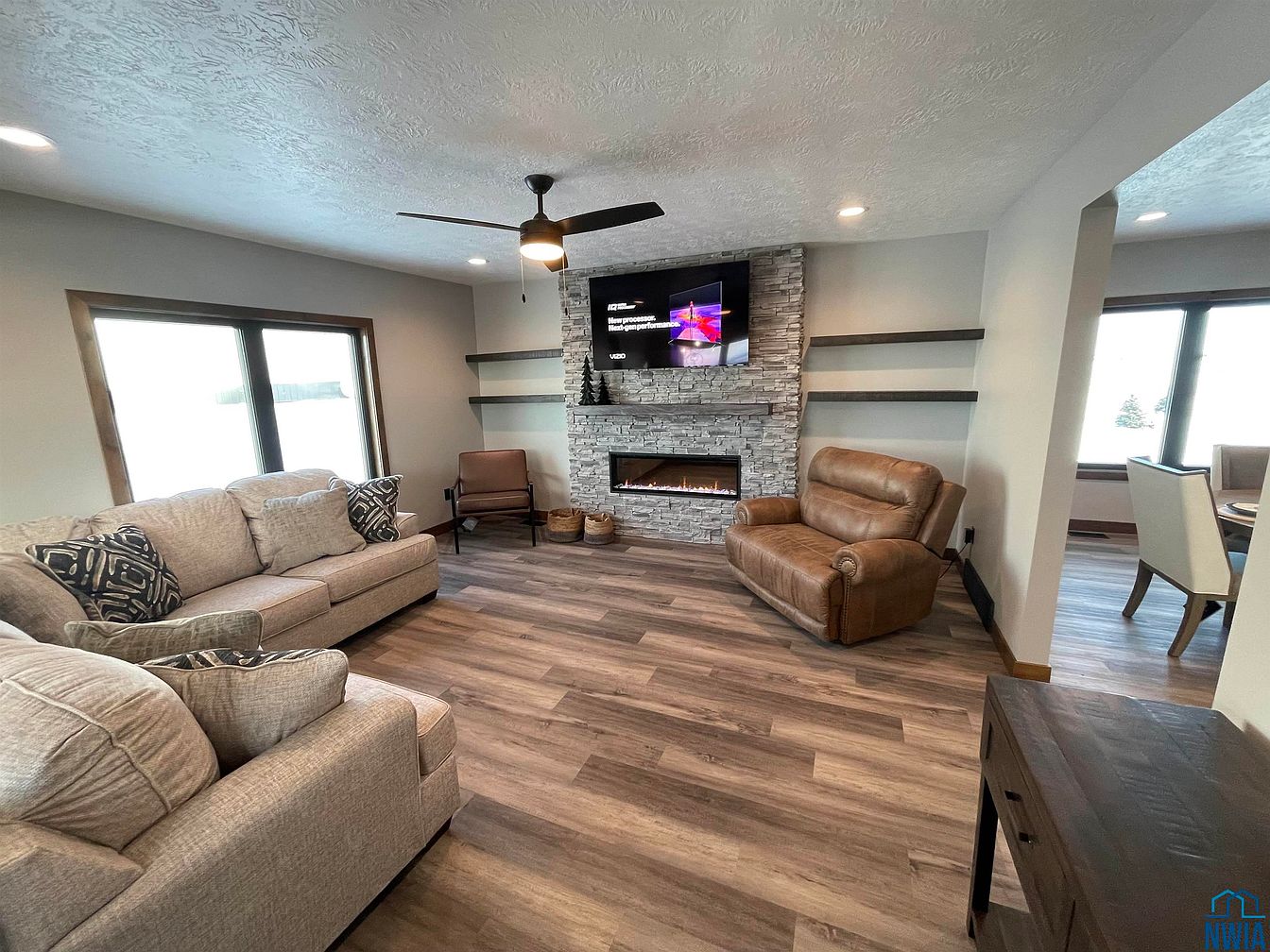 This cozy living room features light gray textured walls and sturdy wooden floors. A central stone fireplace adds warmth, framed by modern shelves for decorative items. Seating includes a large, plush sofa adorned with patterned throw pillows and a comfortable, brown recliner, inviting relaxation. Natural light streams through expansive windows, enhancing the soothing atmosphere. A flat-screen TV mounted above the fireplace offers technological convenience without compromising aesthetic appeal. Decorative elements, including minimalistic shelving and natural textures, complement the contemporary design, balancing comfort and modernity in this inviting space. Overall, the room radiates a welcoming, contemporary charm.
