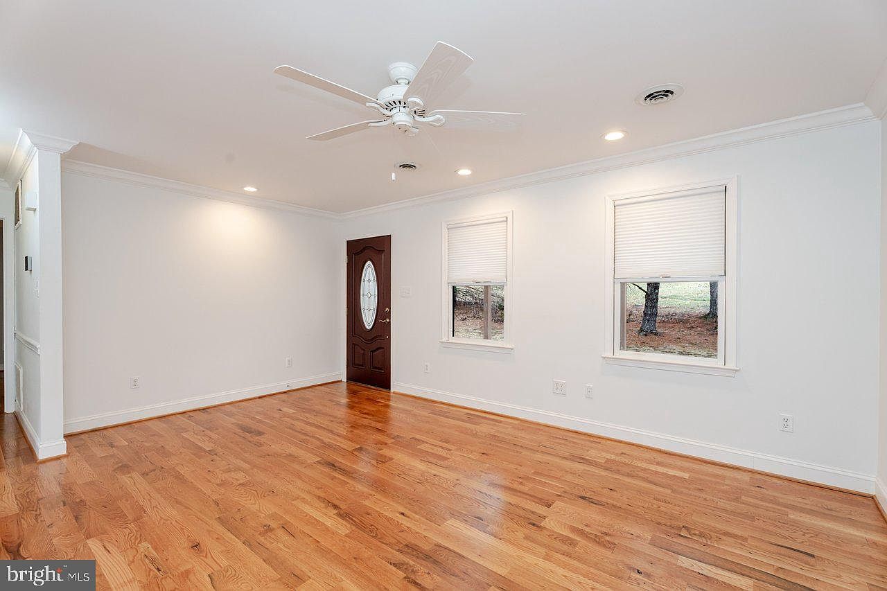This living room features a spacious layout with warm hardwood floors that enhance the inviting atmosphere. White walls create a bright and airy feel, complemented by ample natural light streaming through two neatly fitted windows, adorned with white blinds for privacy. A stylish ceiling fan with light fixtures adds a modern touch, ensuring comfort year-round. The room’s entryway is defined by a classic wooden door, featuring an oval glass insert that invites glimpses of the outside. Crown molding along the ceiling adds a refined architectural detail, emphasizing the room’s overall elegance and simplicity.