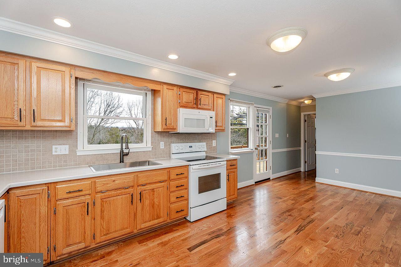 This kitchen features a spacious layout with oak cabinetry that provides ample storage. The light grey walls offer a neutral backdrop, harmonizing well with the warm wooden accents of the cabinets. A modern white microwave and electric stove stand out against the natural wood features. The countertop is sleek and white, complementing the minimalist style. A large window above the sink invites natural light, providing a view of the outdoors. The hardwood flooring adds warmth and texture, while the delicate trim around the ceiling enhances the room’s classic feel. Overall, the kitchen exudes a bright and inviting atmosphere.