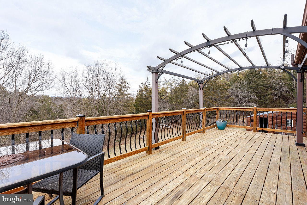 This outdoor deck features warm wooden planks complemented by elegant black railings that lend a stylish touch. A sleek glass-topped table surrounded by modern black chairs invites relaxation and dining amongst nature. Above, an arched trellis supports light fixtures, enhancing the space’s ambiance for evening gatherings. Surrounding trees offer a sense of privacy, while the open view reveals a tranquil landscape. The soft natural hues of the wood contrast beautifully with the lush greenery. A solitary blue planter adds a pop of color, contributing to the overall inviting and serene atmosphere of this outdoor retreat.