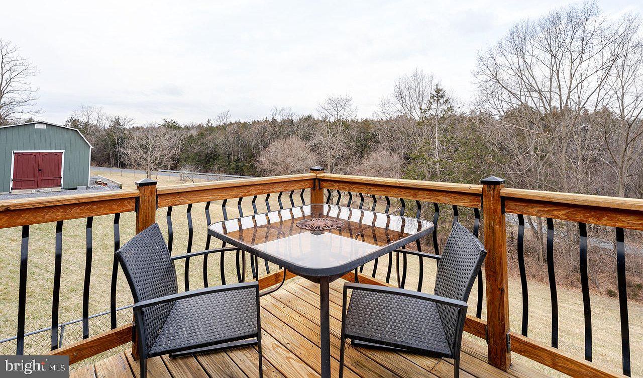 A cozy deck featuring a rectangular glass-top table supported by a central pedestal, complemented by four modern wicker chairs. The warm wooden flooring creates an inviting ambiance, while the intricately designed black metal railing offers both safety and a decorative touch. Beyond the railing, a tranquil rural landscape unfolds with sparse trees and an expansive grassy area, enhancing the serene environment. A rustic storage shed in the distance adds character, contrasting with the natural surroundings. The overcast sky casts a soft light, contributing to the peaceful and thoughtful atmosphere of this outdoor living space.