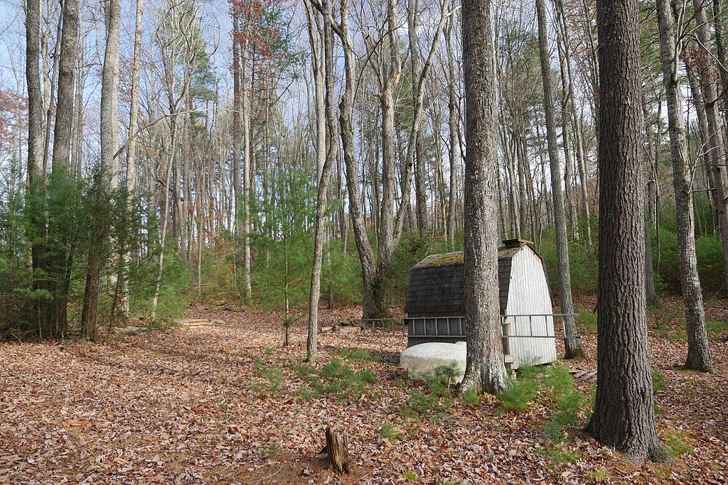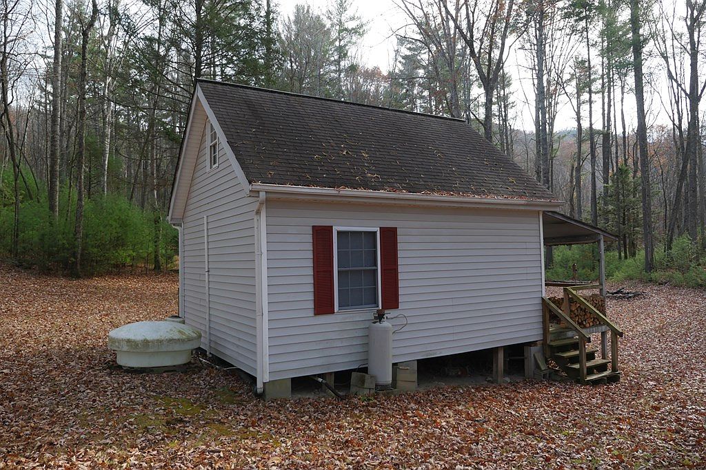 The image shows the back side of a quaint, historic American home surrounded by a natural landscape. The house features a gabled roof and a simple white wooden siding, creating a clean and classic appearance. Dark red shutters frame the rectangular window, adding a touch of color. A small porch with wooden steps leads to the entrance, inviting visitors to explore. To the left, a cylindrical propane tank rests on the ground, indicating utility elements blended into the environment. Fallen leaves cover the ground, enhancing the rustic charm and emphasizing the seasonal change in this serene wooded area.