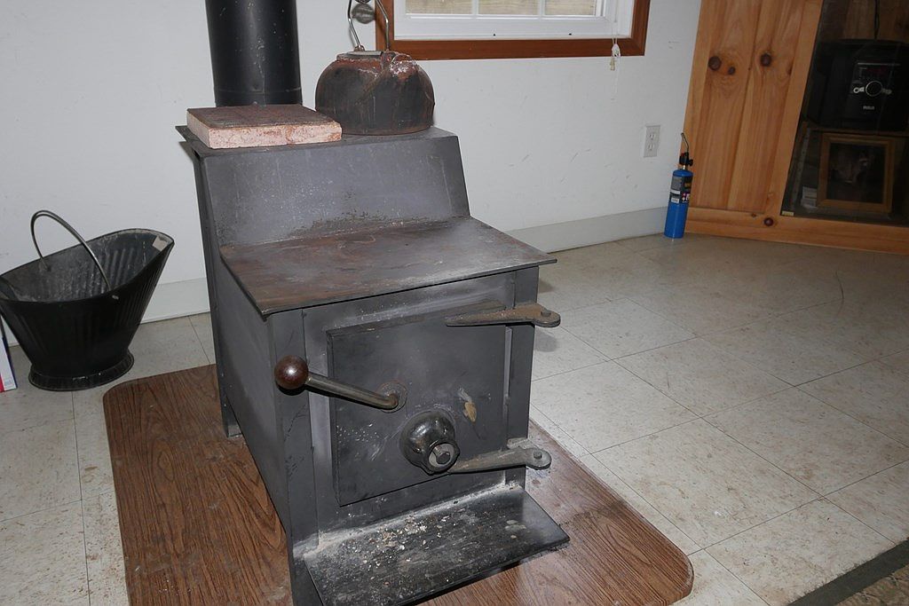 A vintage wood stove occupies a corner of the room, crafted from cast iron with a matte black finish. The stove features a simple rectangular body with a flat top for cooking or heat distribution, complete with metal knobs and levers for operation. Positioned beside it is a black metal bucket, likely used for ash disposal. The surrounding floor is tiled in neutral shades, and a wooden mat is placed under the stove, adding warmth. Natural light streams through a nearby window, illuminating the muted colors of the walls and enhancing the nostalgic feel of this rustic space.