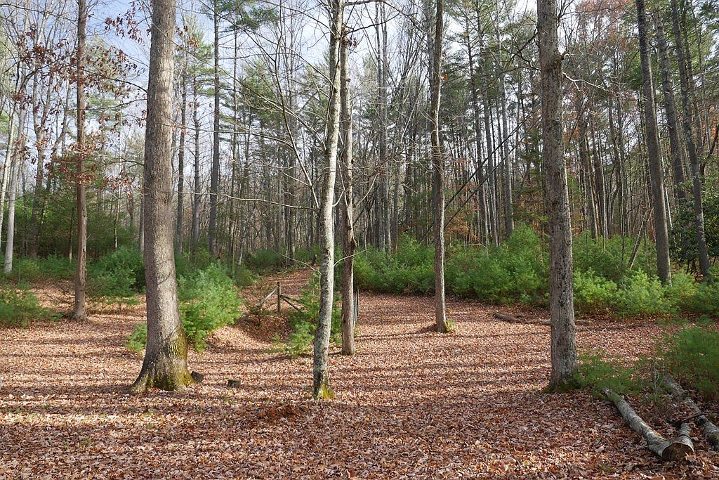 A serene forest area featuring a winding path blanketed in fallen leaves. Tall, slender trees dominate the landscape, with their bare branches stretching towards the sky. Scattered patches of evergreen shrubs add a splash of green against the earthy tones of the leaves. The ground is uneven, with tree roots subtly visible, enhancing the natural, untouched ambiance. Sunlight filters through the canopy, creating dappled shadows that play across the leaf-strewn floor. This tranquil outdoor space exudes a calm and peaceful atmosphere, inviting visitors to explore its quiet beauty.
