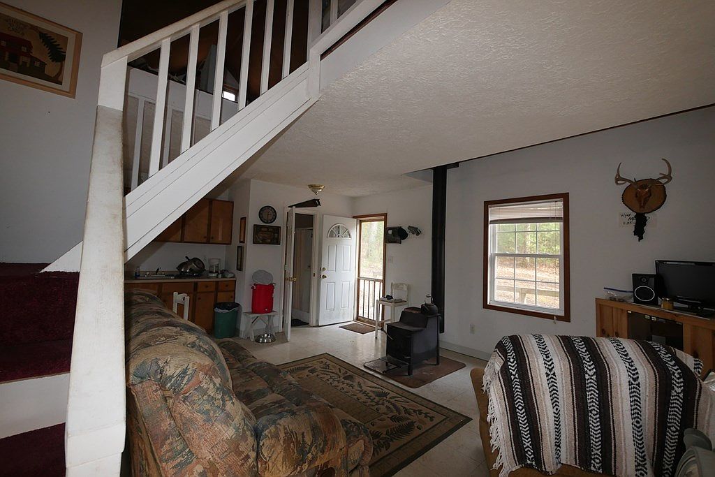 This cozy living room features a blend of rustic and functional design elements. A black metal wood stove serves as a focal point, with a rugged wooden cabinet to its left. The space is accented by a beige and brown patterned area rug that grounds the seating arrangement. A comfortable, multicolored sofa invites relaxation, while a light brown armchair adds warmth. Large windows framed with white trim allow natural light to flow in, complementing the light walls. The staircase, characterized by its white slats and warm wood tones, leads to an upper level, enhancing vertical space.