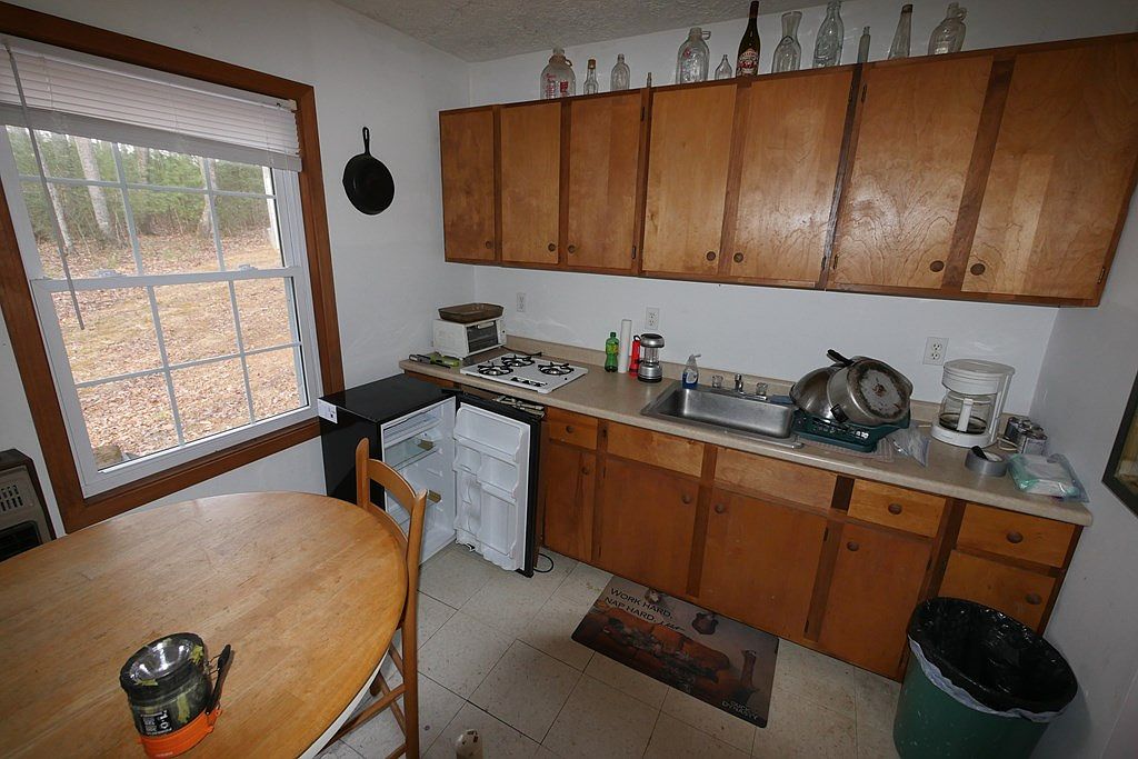 A cozy kitchen corner illustrates a functional yet inviting space. Natural wood cabinetry, showcasing a warm finish, contrasts with the white walls, creating a homely atmosphere. A wooden round table is centrally placed, surrounded by simple, sturdy chairs. Bright light filters through a large window, enhancing the space’s vibrancy and overlooking a leafy outdoor area. Essential appliances, including a compact stove, sink, and newer microwave, emphasize practicality. A modest rug lies beneath the table, adding comfort. An oil heater suggests warmth, while accessories on the counter give a personal touch, revealing an often-used, lived-in feel.