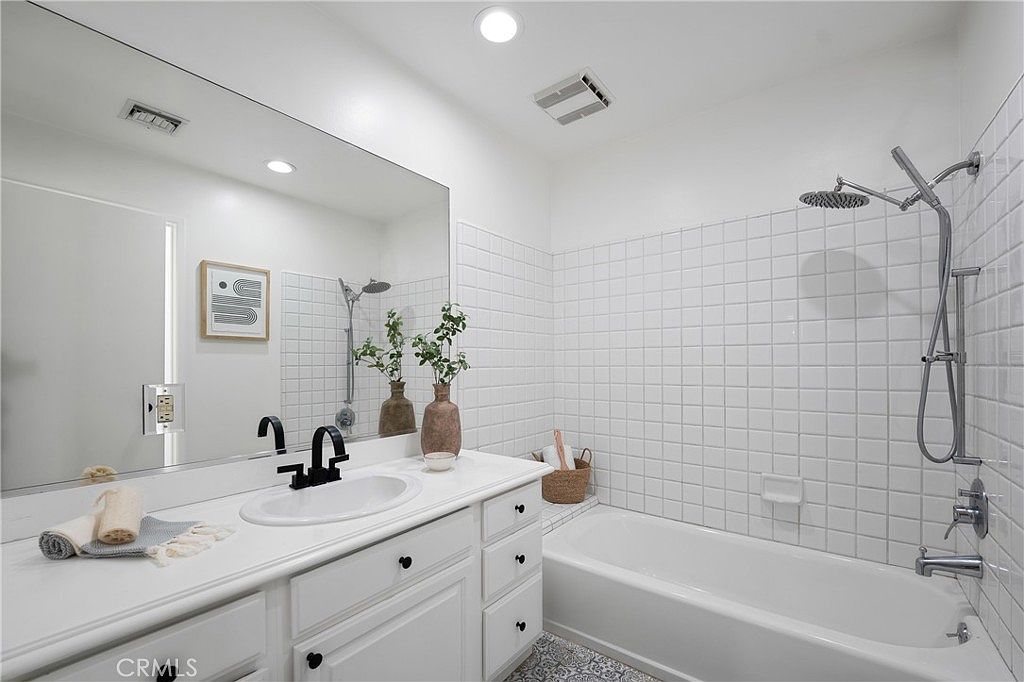 A modern bathroom featuring a crisp white aesthetic, complemented by square tiles lining the walls and a sleek, minimalist design. The double sink vanity boasts a polished black faucet and a smooth countertop, enhancing the contemporary look. Above the sinks, a large mirror reflects soft, ambient lighting, creating an inviting atmosphere. An elegant freestanding bathtub is situated alongside the wall, with a modern shower fixture mounted above. Decorative elements, such as potted greenery and stylish bathroom accessories, add a touch of warmth. The geometric patterned flooring contrasts beautifully with the overall monochromatic theme, ensuring a balanced and sophisticated space.