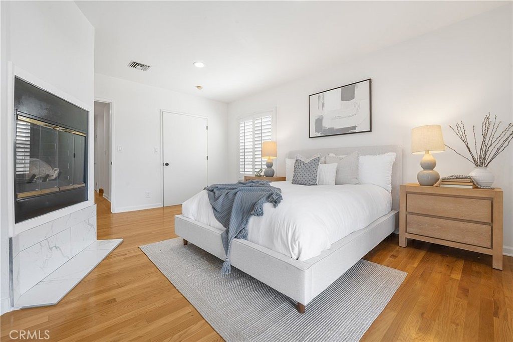 A serene bedroom features a comfortable, light gray upholstered bed adorned with white pillows and a cozy blue throw. The hardwood floor offers warmth, complemented by a soft, textured area rug. A minimalist bedside table holds a lamp with a soft yellow glow, providing a soothing ambiance. Opposite the bed, a sleek fireplace, framed in white marble, serves as a focal point. The room walls are painted in a crisp white, enhancing the airy feel, while plantation shutters allow natural light to filter through. Simple artwork above the bed adds a modern touch, contrasting with the traditional furnishings.